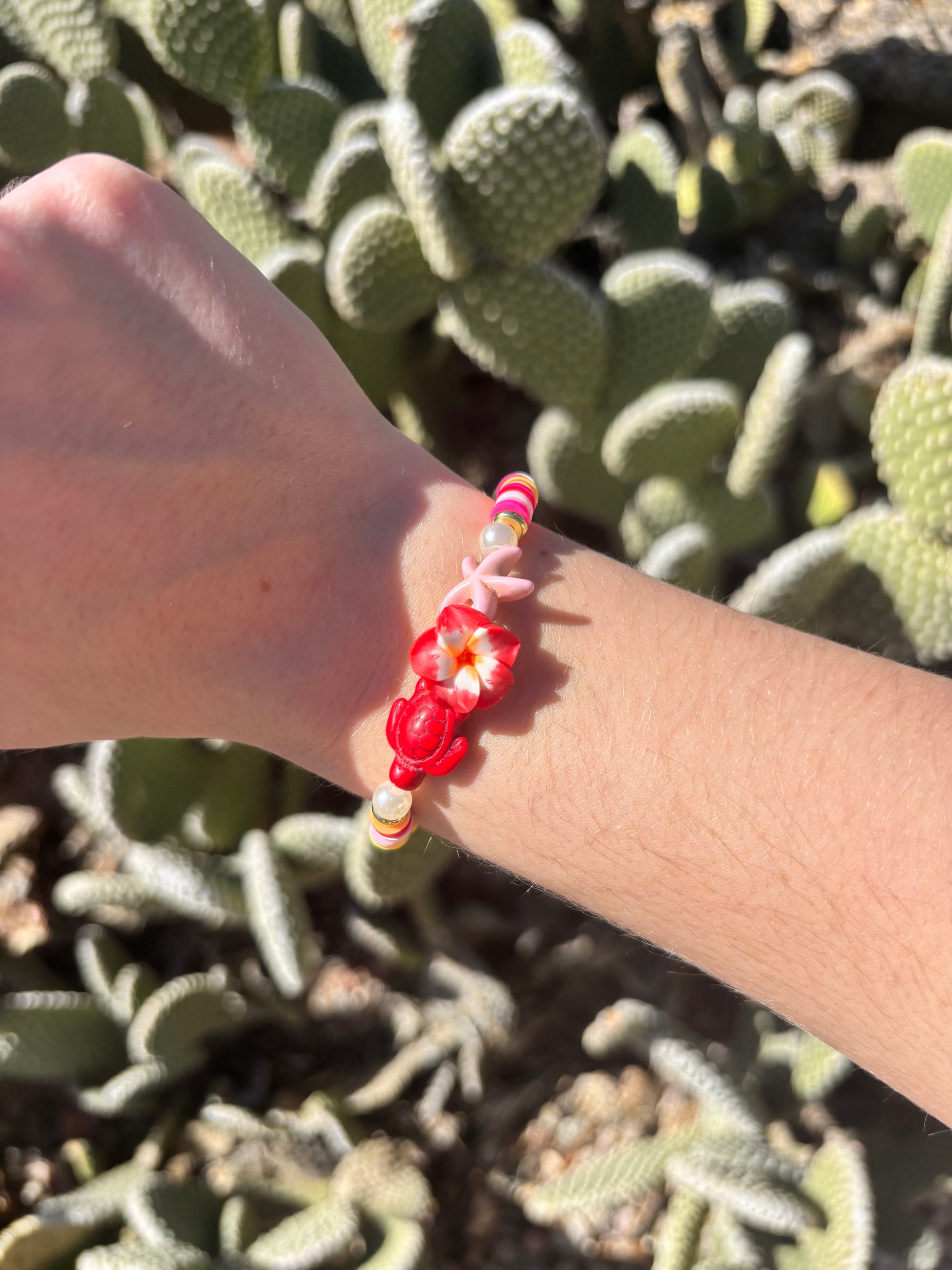Inspired by the warmth and beauty of the Hawaiian islands, the Hibiscus Honu Bracelet features a vibrant red, orange, and white hibiscus flower at the center, symbolizing joy and island life. A soft pink honu (sea turtle) charm sits to the right, representing good luck and longevity, while a tan starfish on the left adds a relaxed coastal touch.